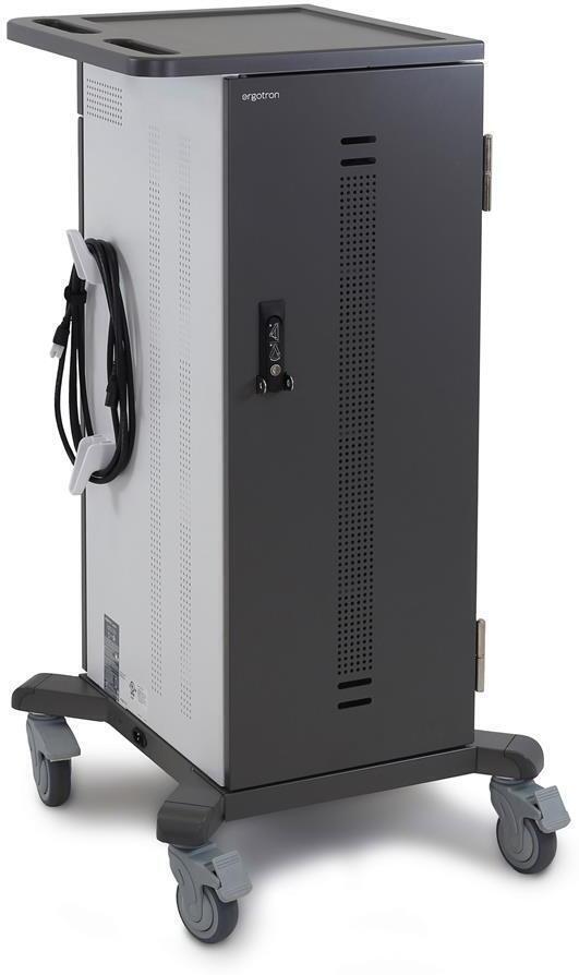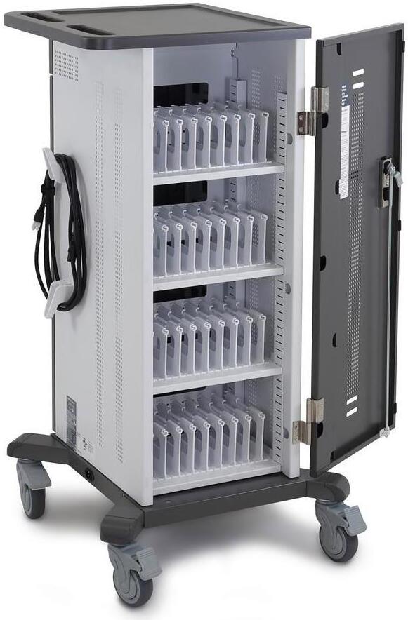 Nabijte až 35 tabletů, smartphonů nebo elektronických čteček v tomto přizpůsobitelném nabíjecím vozíku. Nabízí snadno ovladatelný design bez převrácení, který ukládá a přepravuje vaše zařízení i ve stísněných vzdělávacích prostorách. Pevná dvířka udrží vaše zařízení v bezpečí a lze je odstranit pro rychlý přístup. Upravte šířku pole a výšku police pro vaši technologii v tomto odolném vozíku, který vydrží.
